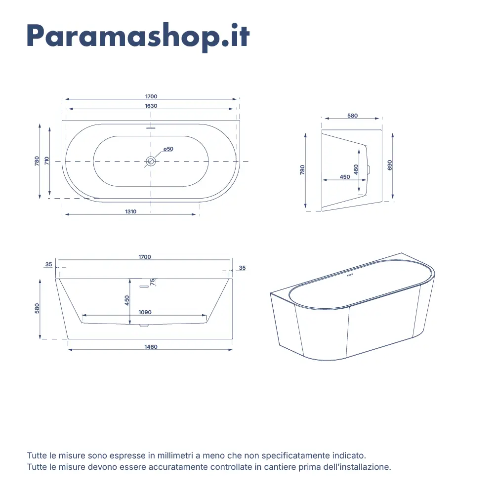 Con le sue dimensioni di 170 cm di lunghezza e 58 cm di altezza, Charlotte è perfetta per un bagno moderno dove comfort e stile si incontrano in un equilibrio impeccabile.