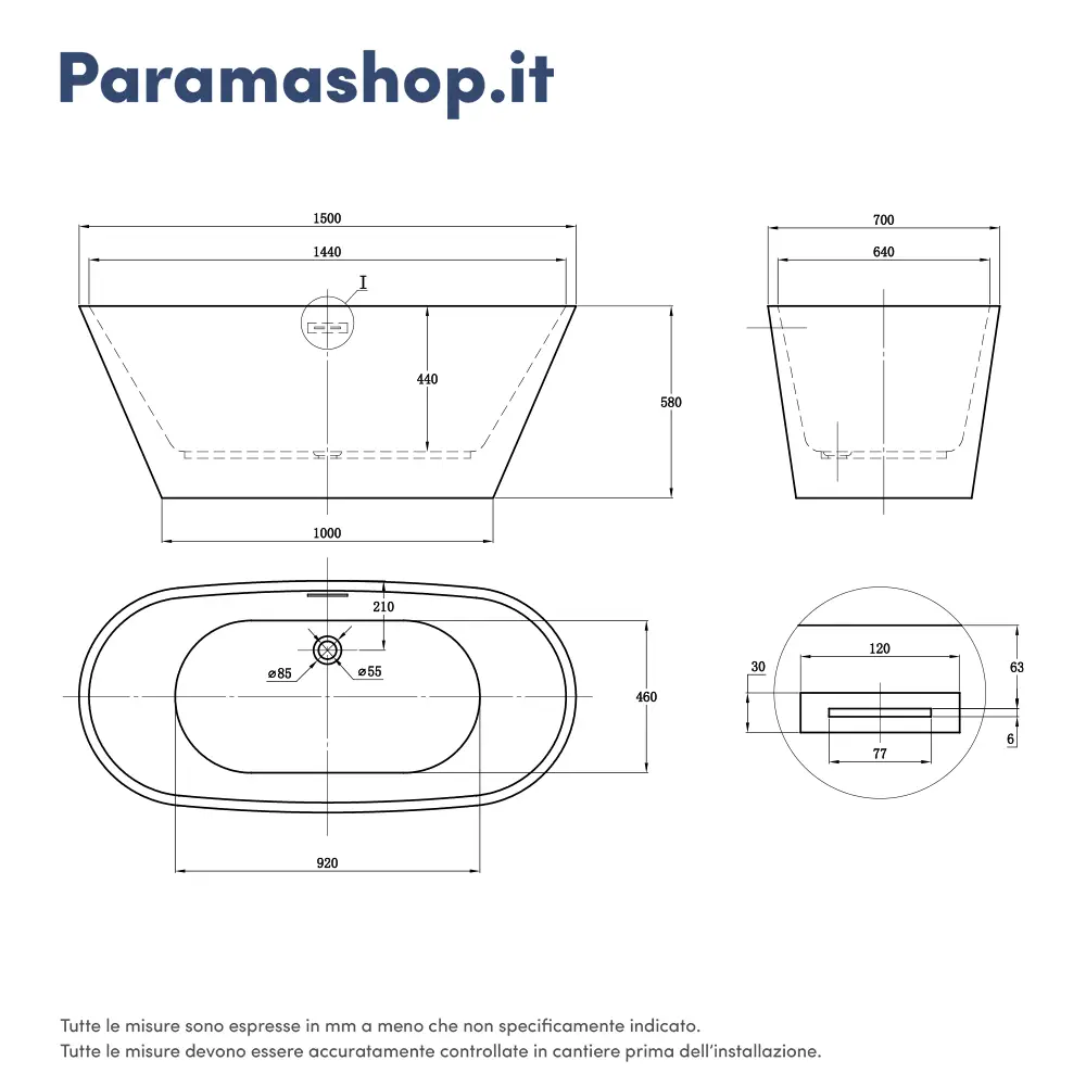 Vasca da bagno freestanding 150cm bianco lucido Mod. Ginevra