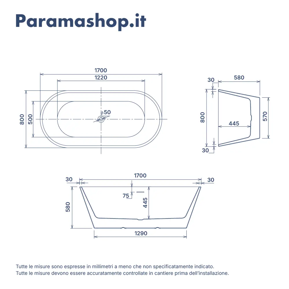 La vasca, con dimensioni 170x80xh58 cm, è progettata per offrire ampio spazio interno senza rinunciare allo stile. Include struttura in troppopieno, piletta click-clack e tubo di scarico, garantendo un’installazione semplice e completa.