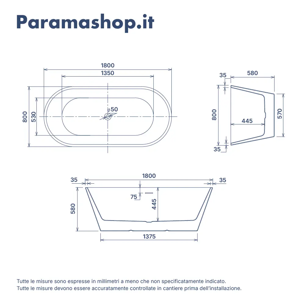 La vasca, con dimensioni 180x80xh58 cm, è progettata per offrire ampio spazio interno senza rinunciare allo stile. Include struttura in troppopieno, piletta click-clack e tubo di scarico, garantendo un’installazione semplice e completa.