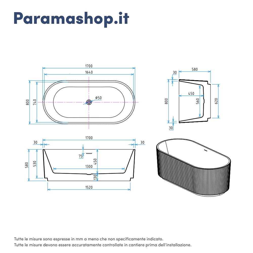 Vasca da bagno freestanding scanalata 170cm in acrilico bianco lucido | Iris
