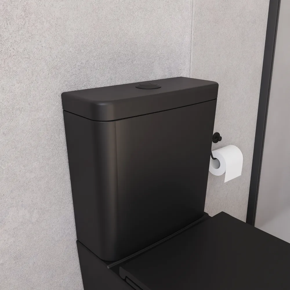 Il wc si presenta in comoda versione monoblocco e include la cassetta di scarico in ceramica abbinata, fornita già completa di meccanismo interno e doppi tasti in finitura nero opaco.