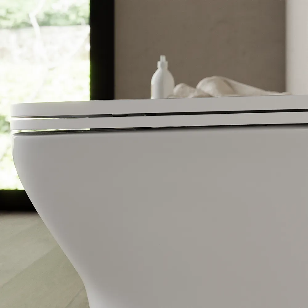 Presenta poi una compatibilità per lo scarico delle acque reflue sia a parete che a terra, con l'apposita curva tecnica, garantendo la sua adattabilità alle varie configurazioni di bagno. E' inoltre dotato di un pratico sedile a chiusura rallentata che offre una chiusura morbida e senza rumori.