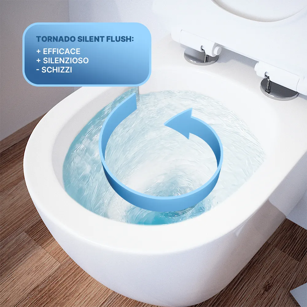 Sydney è equipaggiato con il sistema di scarico Tornado Silent Flush, che genera un potente getto d'acqua a vortice all'interno del sanitario. Questo sistema innovativo permette all'acqua di raggiungere i punti interni più remoti del vaso, garantendo un risciacquo altamente efficace. Inoltre, la sua caratteristica più apprezzata è la silenziosità, che dona un'esperienza di utilizzo confortevole e discreta.